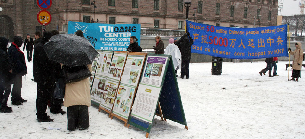 下午学员们又顶着风雪来到了斯德哥尔摩最热闹的皇宫旁的钱币广场(Mynttorget)上,摆上真相展板,挂上“声援五千万人退出中共”的横幅继续向瑞典民众及来自世界各地的人们讲真相,揭露中共对中国民众犯下的滔天罪行。