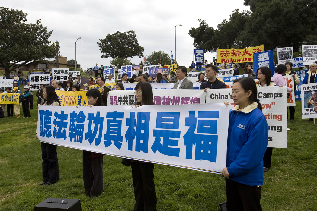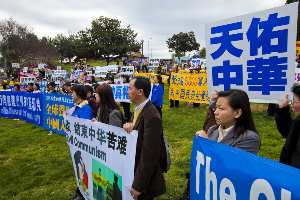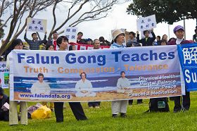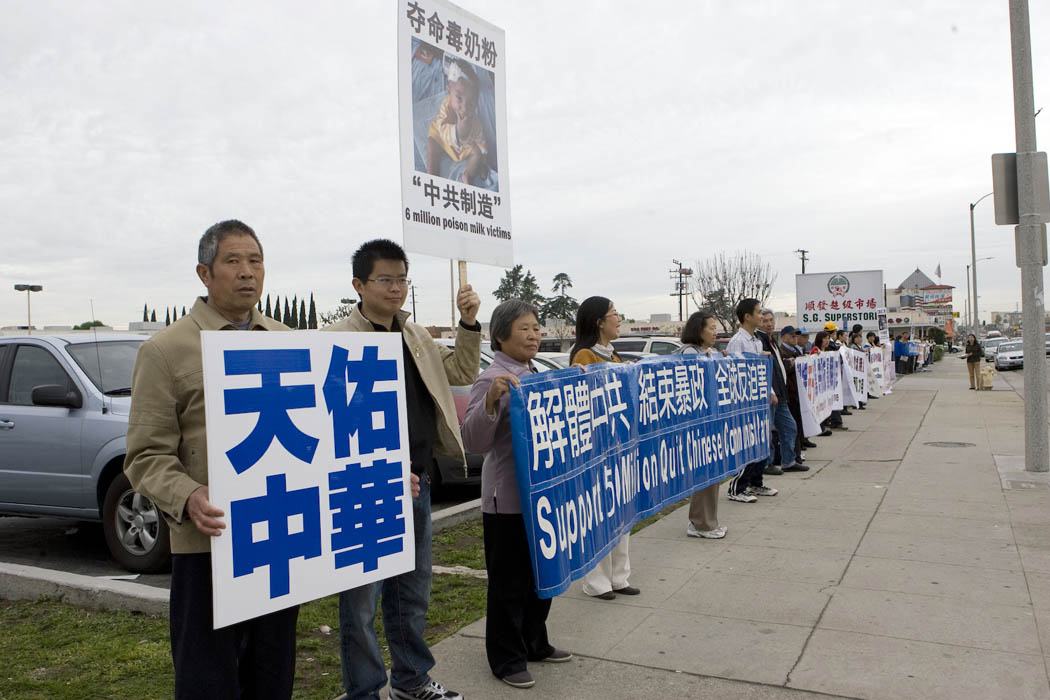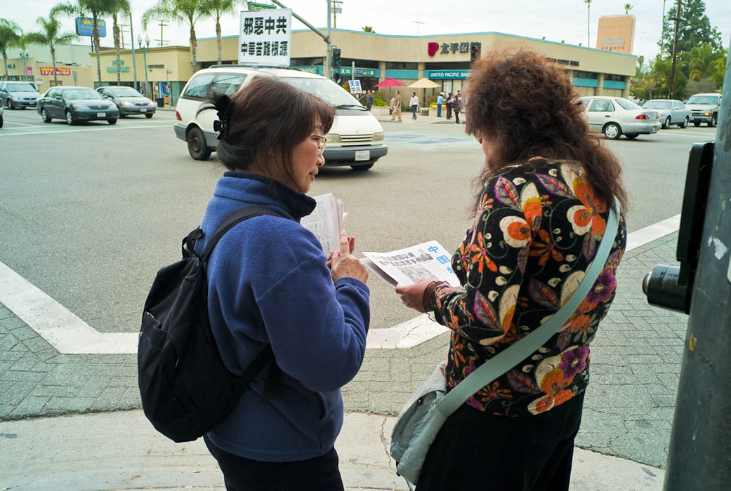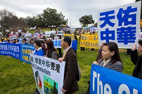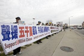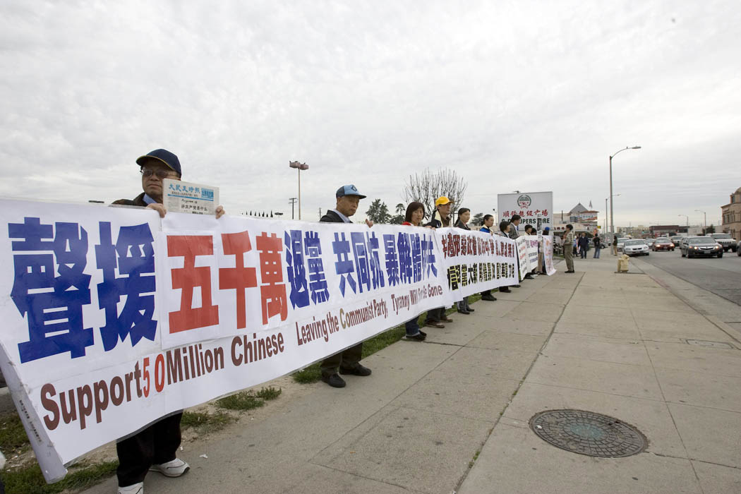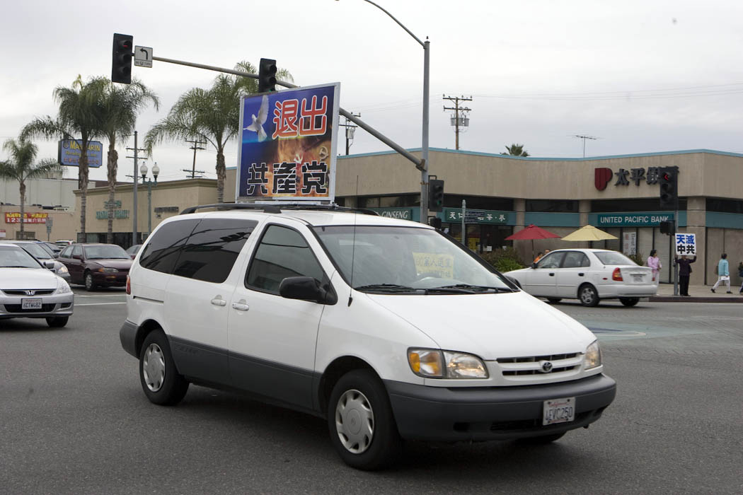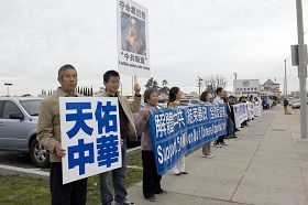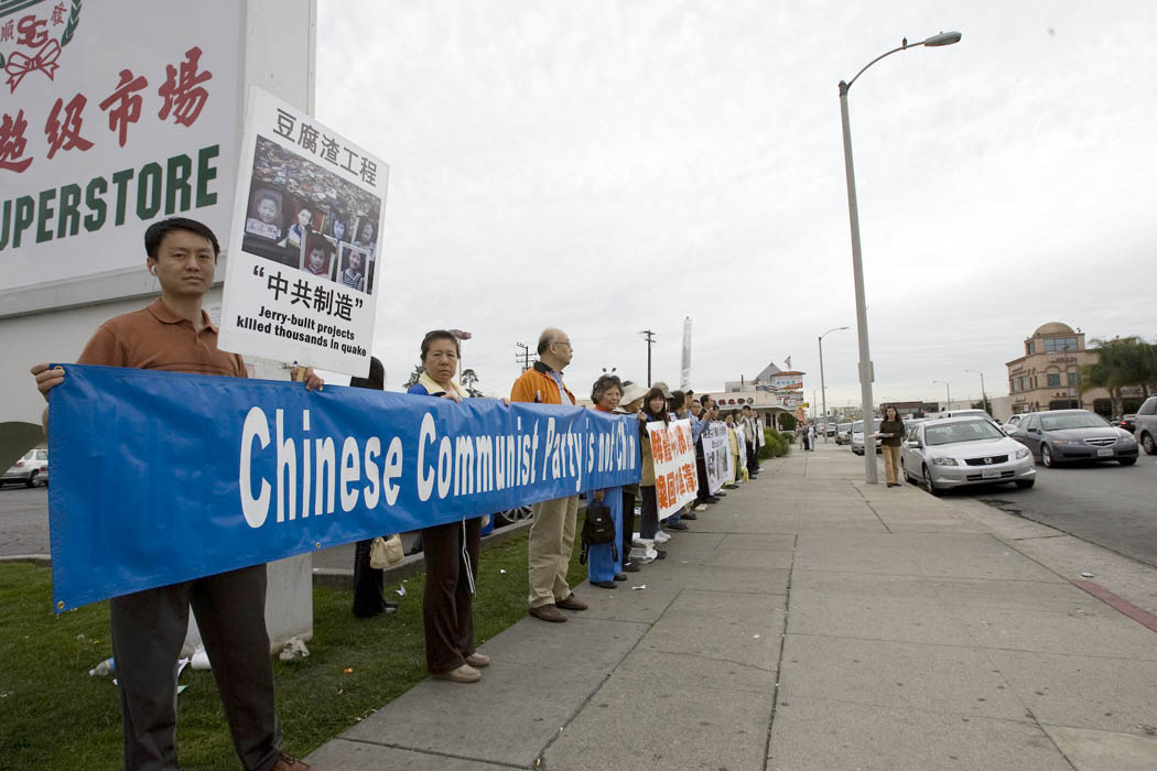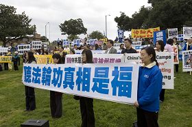 ![]() 在集会结束后,参加的各界人士继续在蒙市附近和另一华人聚居的圣盖博市用横幅标语沿街排出“真相长城”,吸引了众多周末到华人超市采购的过往车辆。 |