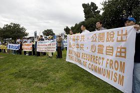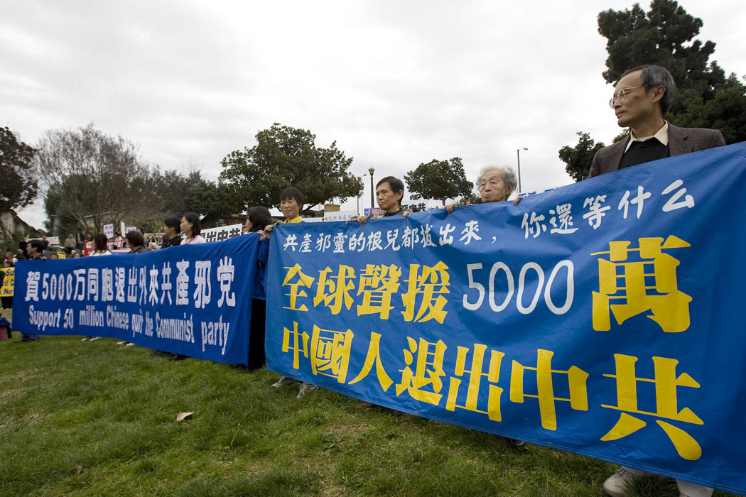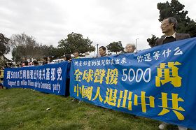 当日上午十点多,在公园的山坡草坪上,集会者展开了“贺五千万中国同胞三:退.”、“告别中共、迎接中华新生”、“退出中共邪*党-、团、队是天赐救命之路”等数十幅大小不一的横幅和标语。