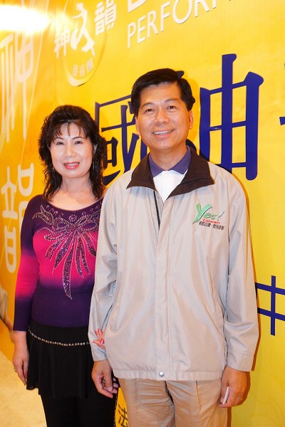经营布料企业二十年,产品外销到全世界各地的铭风布业有限公司董事长蔡昭文,从事布料设计四十余年。此次,他偕其夫人一同前来观赏神韵的表演,对于神韵服装的色彩赞赏不已。他的夫人陈金英的专业是服装设计,也很震撼于神韵的服装。