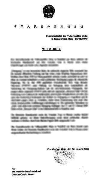 ![]() 中共驻法兰克福领事馆于二零零九年一月六日致信黑森州州政府和当地外国领馆,以国家外交信函形式诋毁神韵艺术团。 |