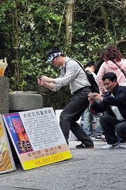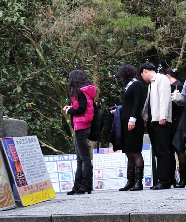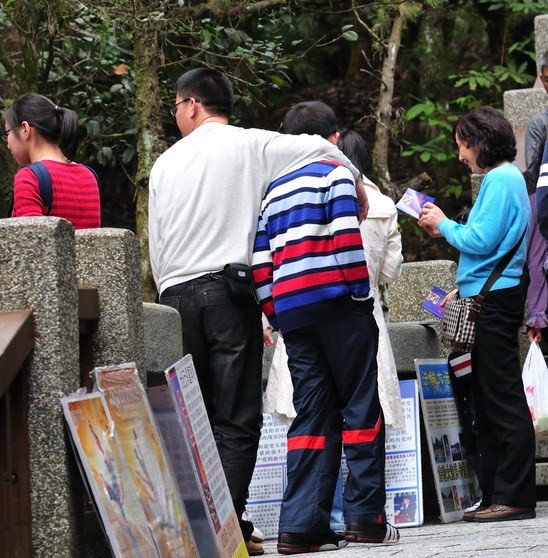 廖女士表示,年假期间从码头走上玄光寺的石阶上,整日人流络绎不绝,大年初三甚至整条路都挤满了人。很多大陆游客看到横幅、展板纷纷拿出相机来拍摄,要将台湾所见带回大陆。他们仔细的读着看板上的迫害真相,还互相讨论。一旁,法轮功学员递上《··*共产党》,并述说迫害真相。廖女士提到,大陆游客很爱听她讲真相,她总是一边走一边大声说,她注意到周围的人都很专心听。她一边跟着游客走,一边告诉他们退!!大潮(退!!、退*-、退*-)的讯息,有些人当场就同意退了。
