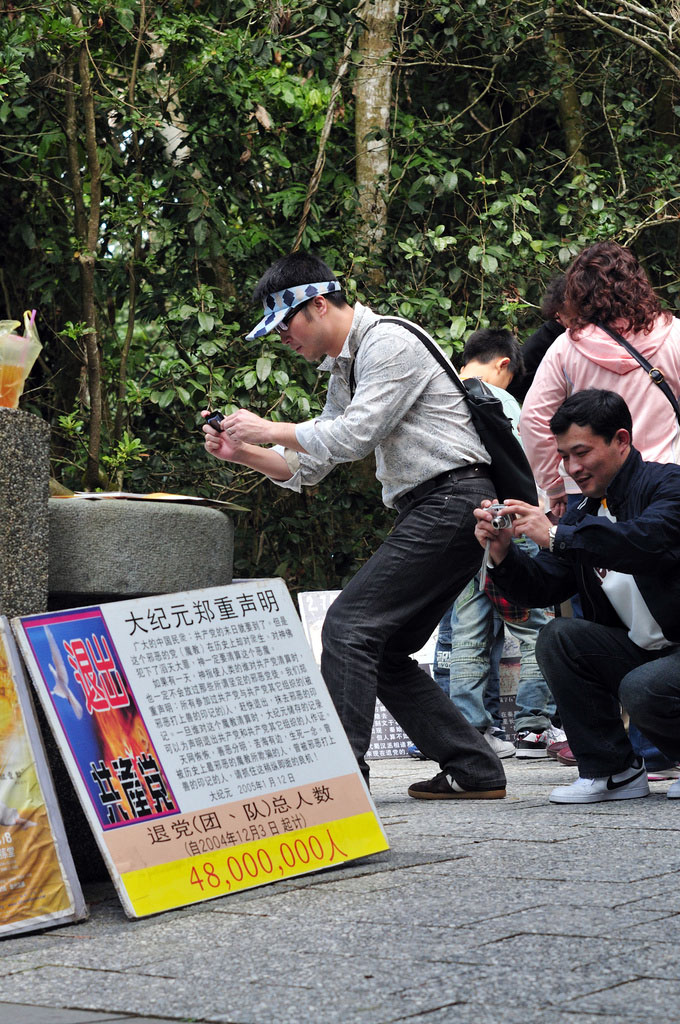 大陆游客纷纷拿起相机要将这海外的法轮功真相展板拍照回去