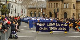 游行组织者Terasa Hung表示,欢迎法轮功天国乐团的演奏和法轮功炼功队的功法演示。Terasa Hung说:“法轮功学员的演出非常精彩,我们非常骄傲能邀请他们来参加游行。他们每年都来参加游行,我们感到非常荣幸。”
