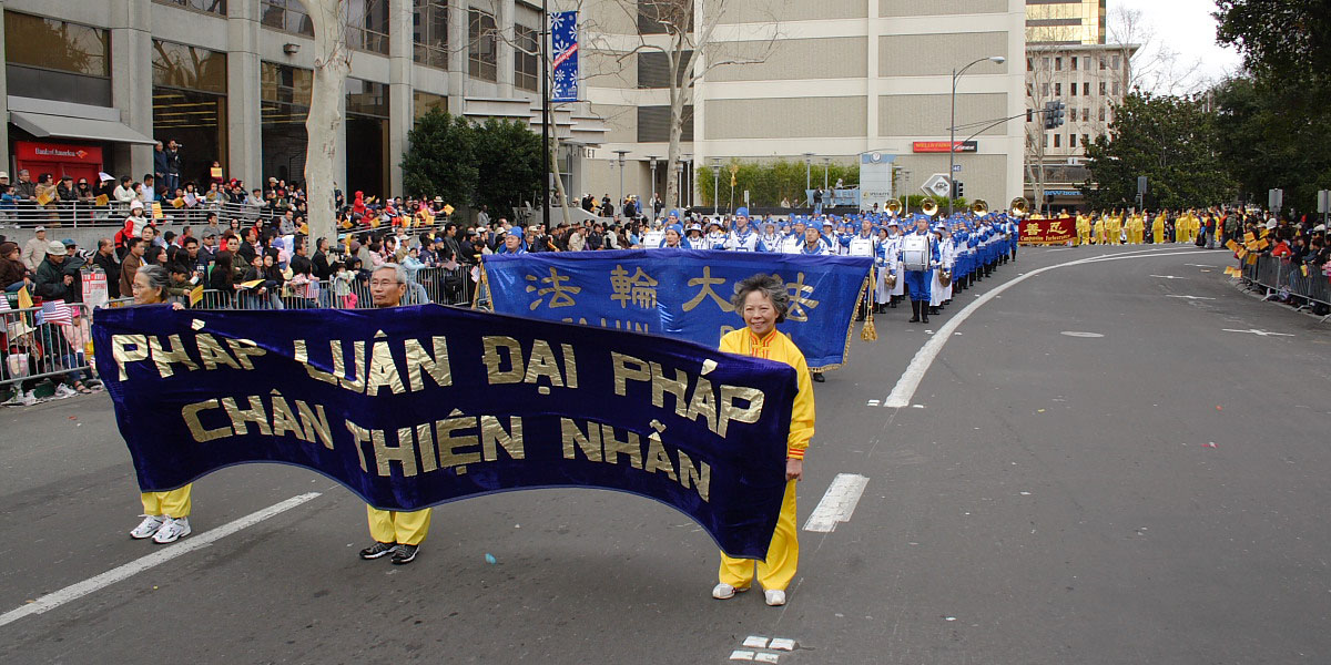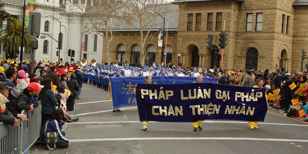 ![]() 法轮功学员手持的横幅上用越南文写着“法轮大法、真善忍” |