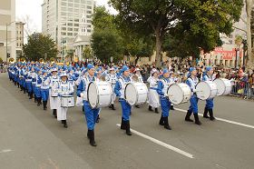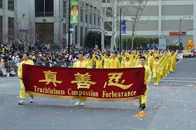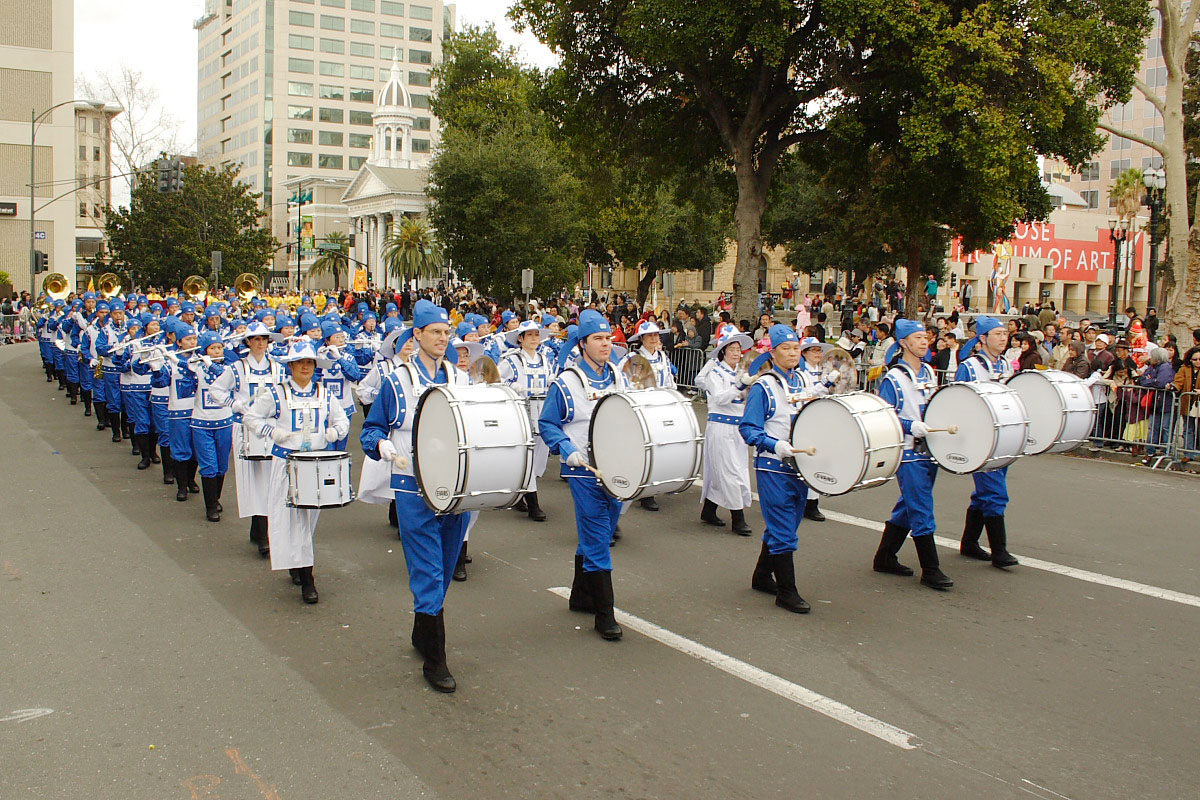 当天的游行队伍穿越圣荷西市的主要街道。法轮功学员组成的天国乐团演奏了《法轮大法好》、《法正乾坤》和《送宝》等乐曲,法轮功学员组成的炼功队展示了法轮功功法,赢得了观众的热烈掌声。