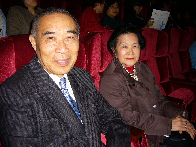 在节目中场休息时,谢国枢先生意犹未尽的坐在座位上和夫人谈论着刚刚的表演,并开心的和场内的其他观众分享。