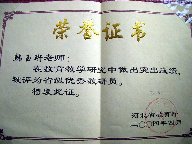 在学术上,大法弟子韩玉珩也有骄人的业绩,1991年在全市生物教师优质课评比中荣获一等奖;1991年撰写的论文《小白鼠不同生长发育时期的小肠绒毛和微绒毛的电镜观察》发表在河北师范大学学报上;1992年因工作成绩突出,荣获市教委记功奖励;1993年在全市电化教学优质课评比中荣获二等奖;1993年在河北省电化教学优质课大奖赛中荣获全省二等奖;1991年和1997年分别在全市范围内做市级观摩课一节;1998年参与编写的全国教育科学规划课题科研成果《条件与方法》由教育出版社出版;2001年参编了《冲刺初中生物奥林匹克》;2002年参编了河北少儿出版社出版的新课标初中生物教材,2003年参加了教师用书的编写。该套教材经全国中小学教材审定委员会审查通过,已在河北、广东、福建、山西、河南、黑龙江、内蒙古自治区等地的试验区使用;2003年参编了河北少儿出版社出版的新课标高中生物教材,该套教材经全国中小学教材审定委员会审查通过,可在全国范围内发行使用;2003-2005年间,受河北少儿出版社和省教科所的聘请,完成了对河北省(包括秦皇岛、唐山、承德、张家口、沧州等地)生物教师新课标、新教材的培训,并对外省的河南省、内蒙古自治区的部份教师进行了培训,培训效果良好;2004年,因在教育教学研究中成绩突出,被省教育厅评为省级优秀教研员;2005年参加了河北省首次生物中考命题工作;2007年她指导的教师张艳娟在河北省高中优质课评比中获一等奖;2008年被认定为秦皇岛市初中生物学科骨干教师;2007、2008连续两年获市级嘉奖。几年来,在河北少儿出版社、河北美术出版社、河北教育出版社、河北科学技术出版社、地质出版社、河北人民出版社等公开发行其参编的高中教科书生物学《遗传与进化》和教师用书、《生物学》八年级下册教材和教师用书及《同步训练》、《新教材同步练》、《中学生物课程培养创新精神和实践能力的研究与实践》、《生物学课堂教学设计案例》上下册、《TB同步训练》上下册、《新课程初中复习指导》等近20 本书籍。