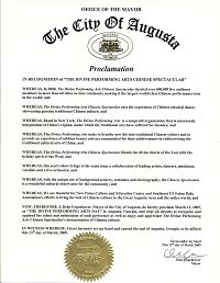 ![]() 奥古斯塔市市长德柯•卡朋汉弗(Deke Copenhaver)与市议会向神韵晚会主办方发出褒奖。市长德柯•卡朋汉弗(Deke Copenhaver)特订“二零零九年三月十三日”为“神韵艺术团日”。 |