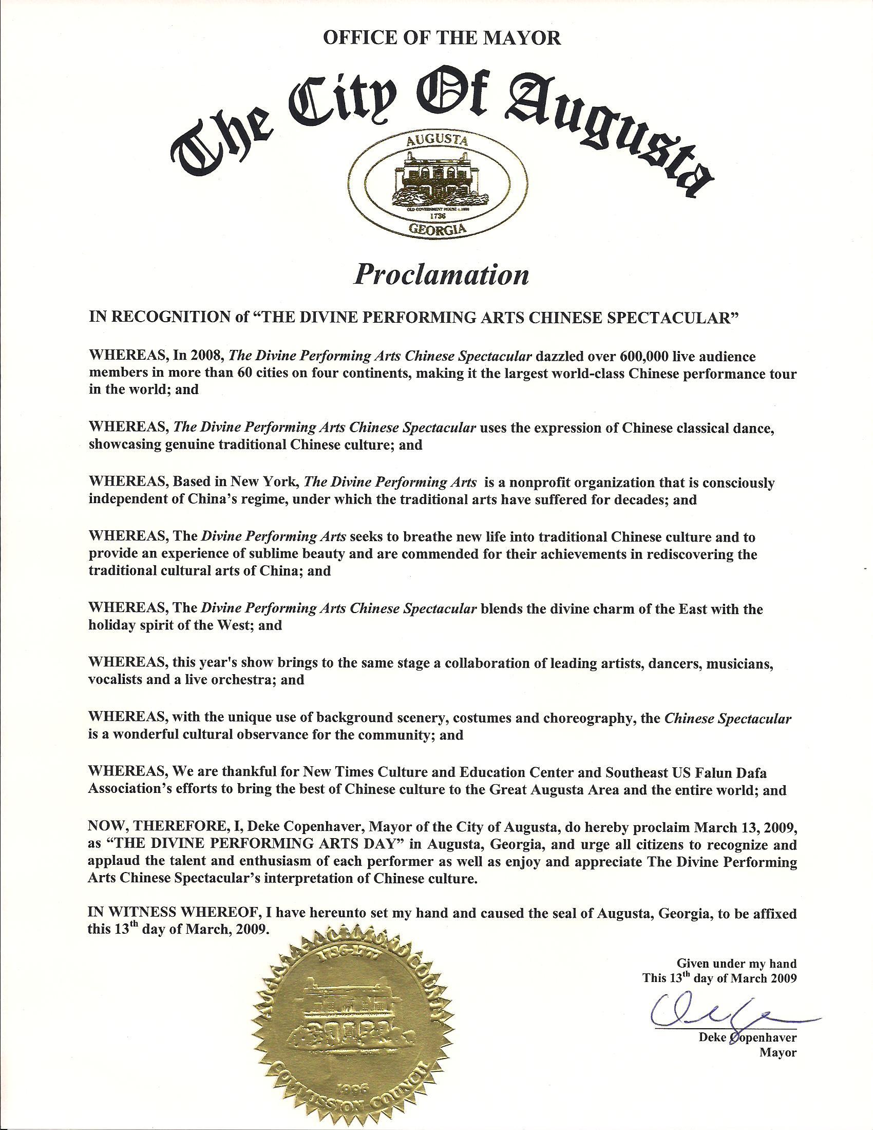 为此,奥古斯塔市市长德柯•卡朋汉弗(Deke Copenhaver)特订“二零零九年三月十三日”为“神韵艺术团日”。乔治亚州的两位国会议员约翰•巴洛(John Barrow)和保罗•勃罗恩(Paul Broun),奥古斯塔市市议会以及艾肯市市长福莱德•卡瓦诺向神韵晚会主办方发来贺信和褒奖。