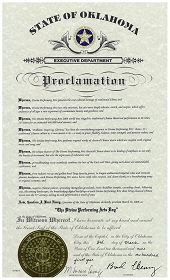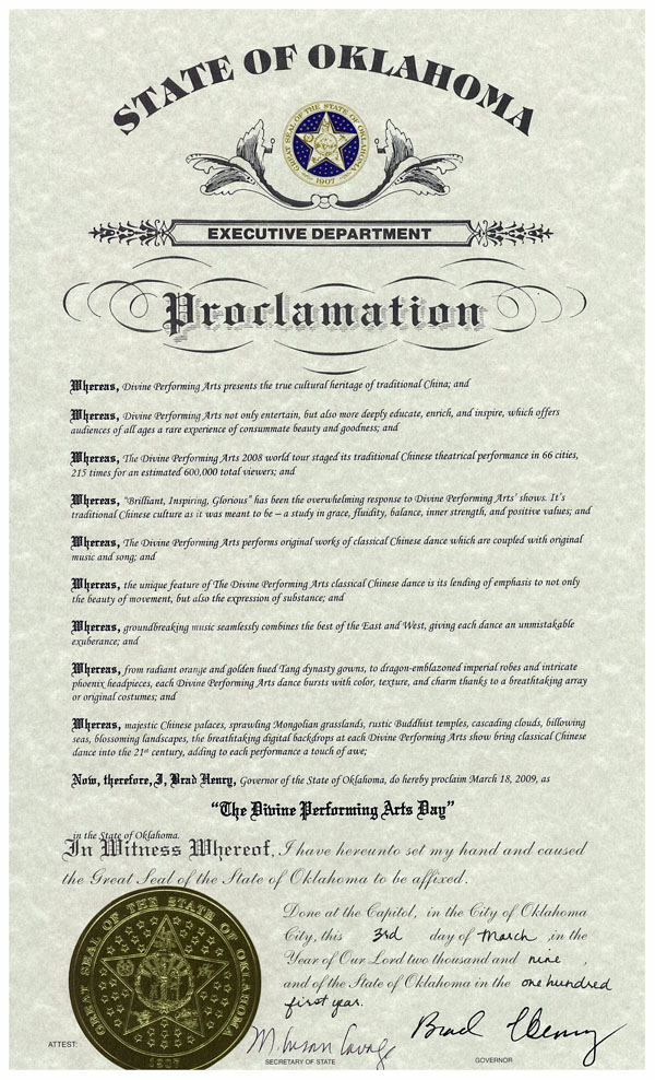 由此,我,布莱德亨利,俄克拉荷马州州长,特此将二零零九年三月十八日命名为全州“神韵日”。