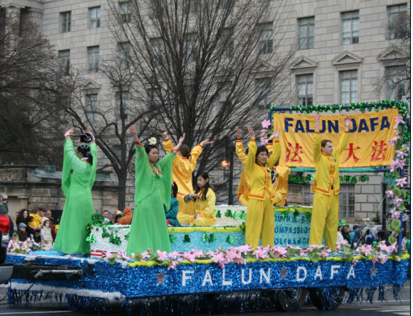 法轮功学员的队伍在整个游行的后半部,学员们特地为此次游行制作的绿色(圣·派翠克日的传统颜色)印有中英文“法轮大法”字样的横幅在队伍的最前面,之后是精心装饰的花车,各族裔的法轮功学员身着唐装和炼功服在花车上向观众们演炼着优美的功法,引来阵阵掌声。后面的腰鼓队精神抖擞,阵阵鼓声传递着春天的信息。