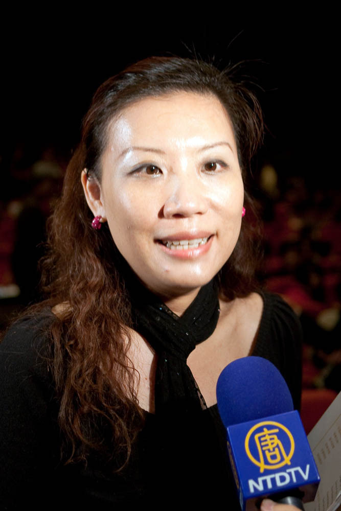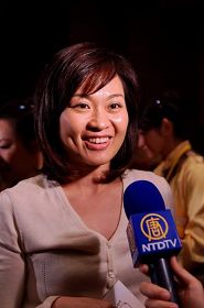 另一位来自江西,嫁来台已八年的聂女士说,“将中华五千年来的文明精髓全部表演出来,好感动!每一个节目都很好,音乐、服装、布景、表演都使我很感动。艺术境界是很高的,在中国没有看过。”“神韵演出会让人想要流眼泪,很感人。特别欣赏关贵敏的演唱,高音很高亢,很浑厚。下次有机会我还是会继续看。”