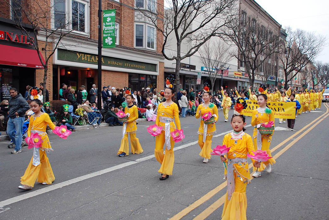 新泽西法轮功学员是第四次参加萨莫维尔市的圣派翠克节游行。队伍由仙女队和炼功队组成,他们祥和美丽的队伍所到之处都迎来热烈的掌声。