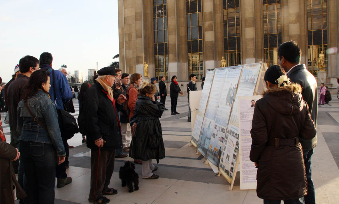 人权广场上还摆设了介绍《·九·评*共产党》的展板,人们纷纷在声援退出中共的征签表上签名。一些从中国大陆来的游客得到了《·九·评*共产党》小册子,还有大陆留学生和巴黎华人也都索取了资料。