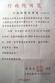 ![]() 行政院长刘兆玄致赠“顺祝活动圆满成功,与会诸君健康快乐”的贺电 |