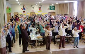 法轮功学员首先介绍了什么是法轮大法和大法洪传全世界的情况,随后学员讲述了自己多年来的修炼体会,还介绍了法轮功在中国受中共迫害的情况及真相,最后教授和演示了五套功法,全体老年人俱乐部成员都跟着一起学炼功法。