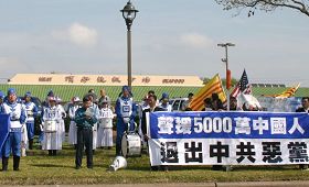 游行队伍最前面的是主题横幅“声援五千万勇士退!党!”,格外醒目。后面是德州天国乐团,神采奕奕的演奏乐曲,紧接着是声援退出中共方阵,高举横幅“退出中共恶党”、“《·九·评*共产党》引发退!党!大潮”等,一些社团人士参与了此方阵的游行。