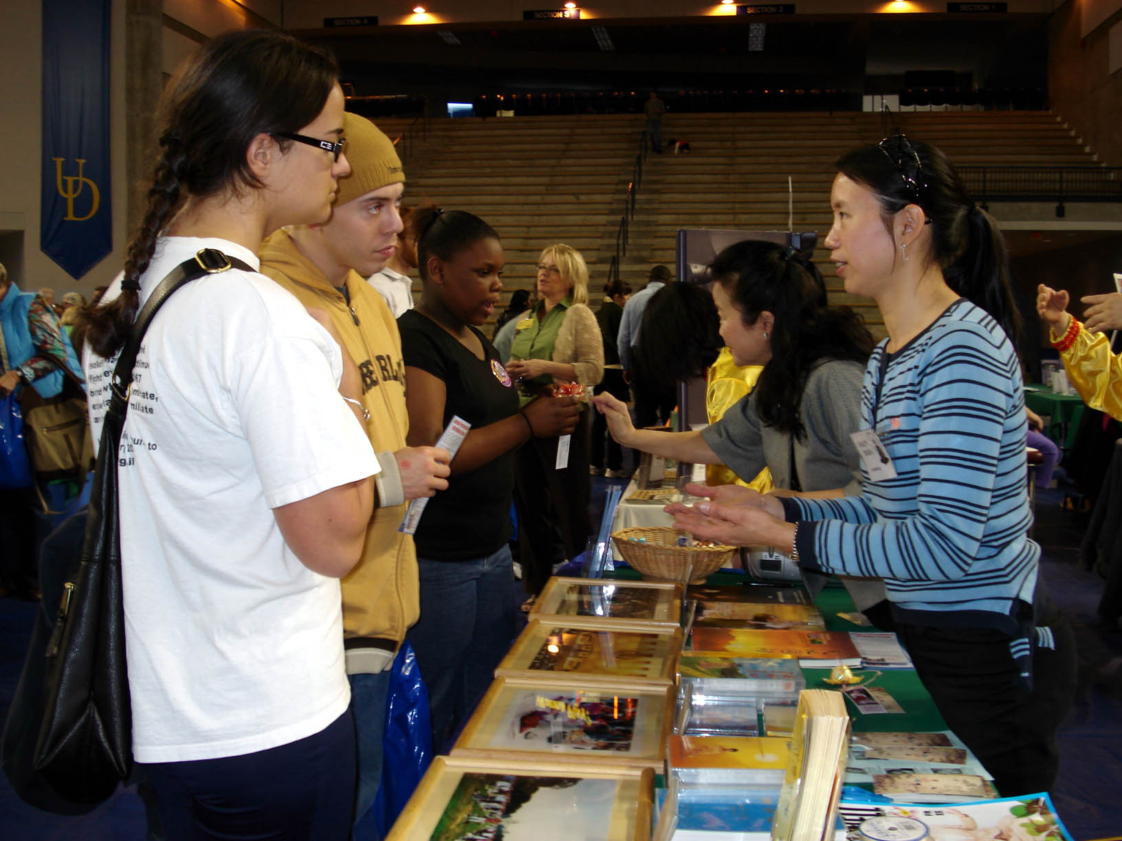 将近一天的博览会,法轮功的展位成为当日的“明星”,五套功法演示,祥和宁静。展位前时不时地挤满了人群,有时甚至被挤得水泄不通,人们不停地打听,在哪有教功?听说大法弟子都是义务教功,许多人感到惊讶,当他们从大法弟子的介绍中明白了法轮功是本着“真、善、忍”的法理去修炼,不追求世间的名与利,在场的人深受感动,许多人表示要学功,纷纷地记下了当地炼功点的详细情况。博览会结束时已约有上百名西方人表示要来学炼法轮功。不少人买了书,炼功CD,以及教功录像带。