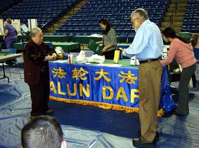 下午四点,博览会结束了,忙碌了一天的参展者都在打包收摊。在法轮功展位前。一位名叫阿普度•马及德(Abdul Majid)的老人却迟迟不愿离去,他仔细的看着介绍法轮功的各种资讯,认真听着讲解。当他看到法轮功学员林妈妈后,好奇的询问,“你多大年纪了,也炼这个功吗?”当他得知林妈妈已八十岁了,炼法轮功已经十年了,Abdul信心大增,拉着林妈妈连说了几个“请”字:“请你现在就教我好吗?Please(请)! Please(请)! ”他认真的跟着林妈妈炼完第一套功法后表示,感觉真好。当他得知德拉华炼功点地址后,兴奋地象个孩子,说:“我家就住在附近,从我家到那儿只有三英里多。”阿普度•马及德是一名退休的会计师,从巴基斯坦来到美国,在美国已经生活四十年了。