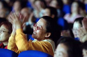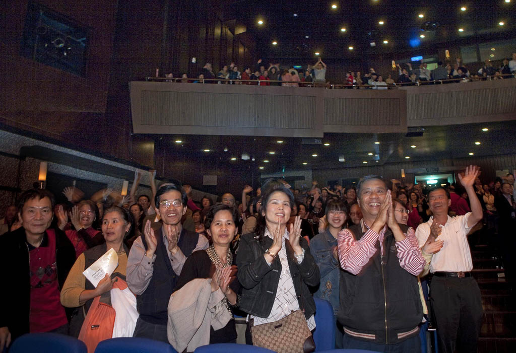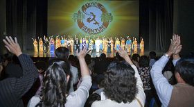 ![]() 三月廿五日神韵在台湾压轴场,全体观众起立挥手致意,演员们四次谢幕。 |