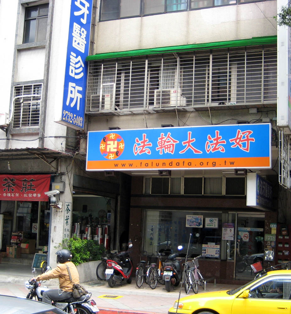 ![]() 沈牙医诊所外的“法轮大法好”看板 |