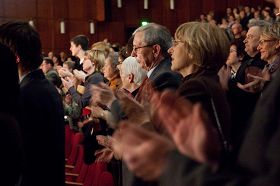 ![]() 演出结束时,全场观众起立长时间热烈鼓掌,向神韵艺术家们的精湛表演致意 |