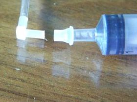 3、排除管线空气。用弯头的胶圈把注射器和管线上的弯头连接起来抽墨,直到墨水抽到弯头附近(也可以拔下墨盒弯头上的管线,用注射器针头直接插入管线抽出空气。有时候这种方法很方便,比如套在弯头上的管线不是很紧的情况。但要选用大小合适的针头)。抽出所有管线空气后关闭管线阀或对折管线后用胶带粘牢使墨水不会回流。见下图: