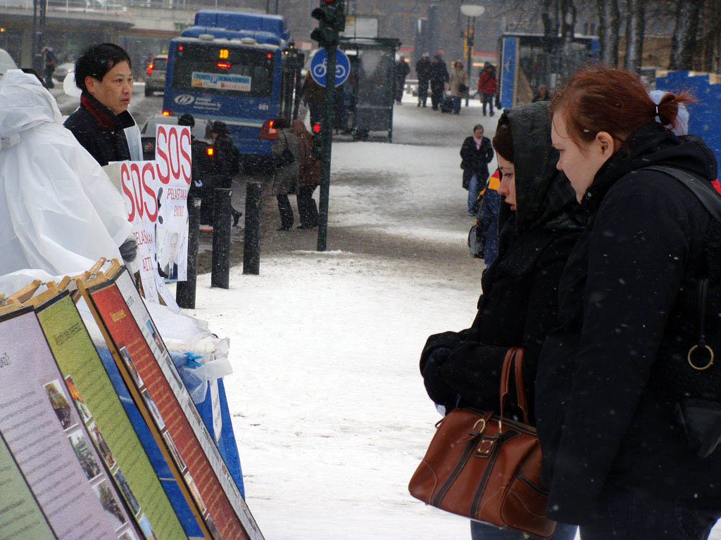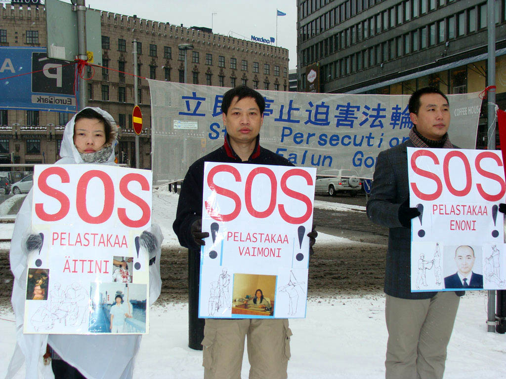 学员小金是去年七月来芬兰访友的,她的母亲在她抵芬的第二天在中国被非法抓捕,并被非法判处八年有期徒刑。小金虽然逃脱,却从此有国难归,未成年的妹妹也因此失学,靠朋友接济生活;去年末刚从泰国被营救出来的学员老吴,夫妻二人原来都是高级白领,妻子因坚持修炼被非法判十年徒刑;学员小史的舅舅先后被中共非法关押三次,受尽毒打、酷刑。三位学员将镶嵌着亲人像片的营救呼吁牌举在胸前,默默地讲述自己的故事,呼吁人们共同关注,帮助解救他们的亲人。