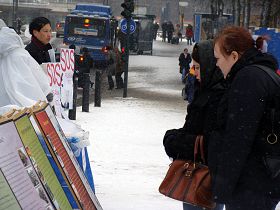 十来个年轻人路过广场,看见有学员举着展板,就询问这里在搞什么活动。学员安娜(Anna)跟他们解释:这三个学员的亲属至今还在中国被关押迫害着,他们在这里呼吁人们帮助他们的亲人获得自由。那些年轻人一改他们满不在乎的做派,毫不犹豫的排着队签了名。他们还告诉学员说大家都知道中国的(人权)情况很糟。再次经过活动地点时他们又主动和学员们打招呼,表示他们的关心。