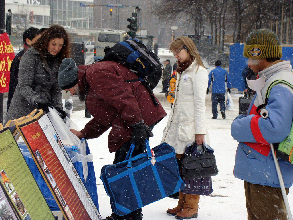 ![]() 三位法轮功学员站在风雪中举着营救亲人的展板 |