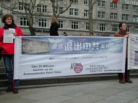 一周的阴雨连绵,在周五划上了一个句号,周六(二零零九年二月二十八日)德国科隆大教堂前又是人来人往,游客络绎不绝。来自科隆退!党!中心的义务工作人员和周边城市的一些支持者相聚在大教堂前,庆祝全球五千万民众“三:退.”(退!党!、退*团-、退*队-)的活动。