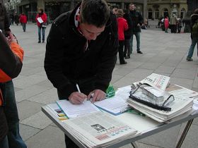 一位年轻的导游带着几个游客出了大教堂,退!党!中心的义工热情的迎上去,在简短的寒暄之后,问及“三:退.”的事,并愿意赠送退!党!的真相资料,一个游客犹豫了一下,看着导游,不置可否。只见这个年轻人真诚地对义工说,“谢谢,谢谢你们所做的。”义工也诚恳地对他们说:“我们都是用业余的时间来将真相去告诉别人。”年轻人感动地对义工说:“是的,我们需要知道真相!”之后其他游客们非常高兴地接下了真相资料。