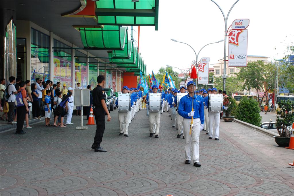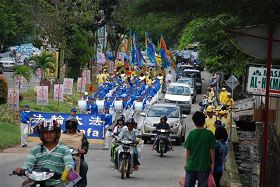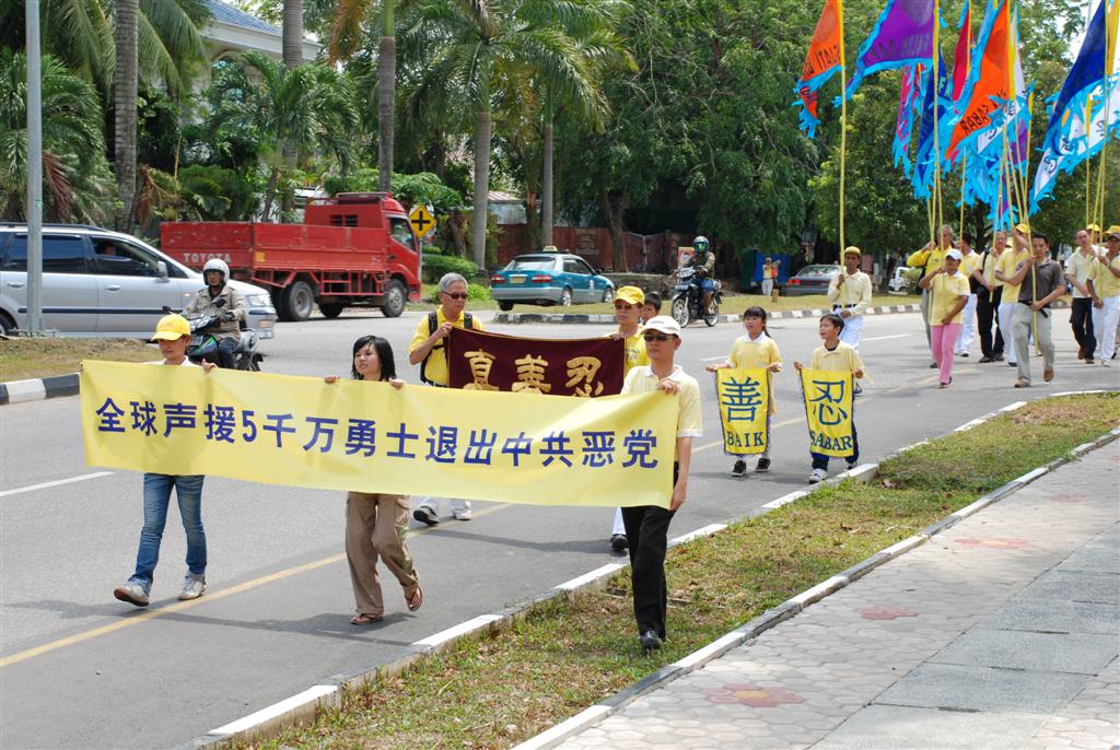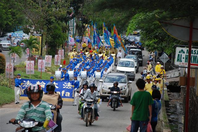 百人天国乐团蓝色的方阵格外醒目,加上气势磅礴、节奏明快的军乐演奏深具感染力,因此所到之处都吸引了所有人的目光。人们沐浴在“法轮大法好”的洪音之中,尽情地欣赏着这从未有过的新奇与震撼!此外,游行队伍还有腰鼓队。鼓声与号声交响回应,使这座一向沉默的岛城变得热闹非凡。参加游行的退!党!服务中心义工们在街口发放了关于退!党!的真相资料,所到之处向行人讲清真相。一些当地的马来人之前没有听过中共邪*党-对法轮功迫害,在阅读了退!党!义工发放的真相资料之后,显得非常激动。