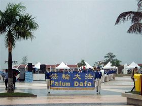 中午过后骄阳似火,游行队伍在烈日高温之下行走了七公里,每个人都被汗水湿透了全身。临近傍晚时分,天气突变,狂风黑云夹着暴雨倾盆而下,一瞬间积水横流,雷电轰鸣,震耳欲聋。民众纷纷躲到海岸边的凉亭内去避雨。但是天国乐团的一百多位成员则坚持在雨中继续表演,《法轮大法好》、《法鼓法号震十方》和《送宝》等天国圣乐在暴风雨中持续地响起,大批民众深受感动,报之以热烈的掌声。随后雨势逐渐转小,乌云慢慢散去,远方露出了一丝灿烂的阳光,游行在下午五点钟圆满结束。