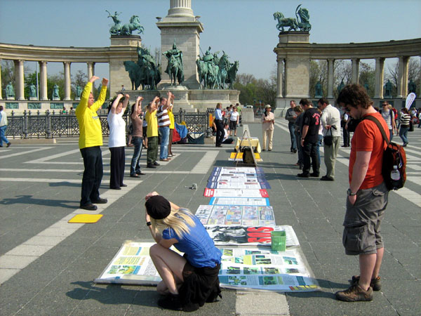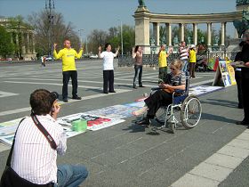 ![]() 在布达佩斯的英雄广场上,法轮功学员展示祥和优美的功法,吸引民众驻足。 |