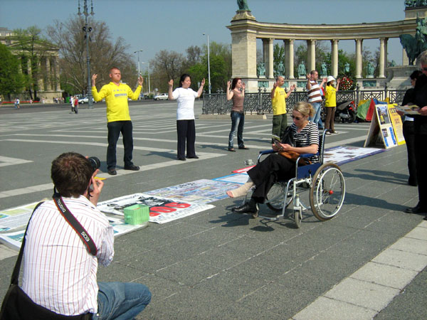 随后,学员们来到市中心的英雄广场上,面对来自德国、爱尔兰、马来西亚等世界各地的游客和匈牙利民众,展示法轮功祥和优美的功法,大量民众聚集到图板前,仔细阅读,纷纷拍照。一位高大的匈牙利男子一幅一幅图板看过之后,双手在面前合十,面对正在炼功的学员微微鞠躬,表示感谢和敬意。一个坐轮椅的女士由儿子推着在图板前长时间默默地阅读、思考,她的儿子则变换着角度拍下学员们祥和的炼功场景。一位年轻女孩以学员炼功的祥和场面为背景,请朋友为她拍下了多张照片留念。