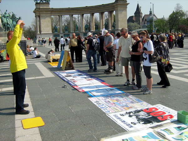 ![]() 来自世界各地的游客和匈牙利各阶层的民众在法轮功真相图板前驻足阅读 |