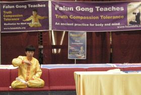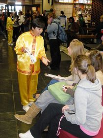 ![]() 学生中心里的法轮功真相横幅和功法演示 |