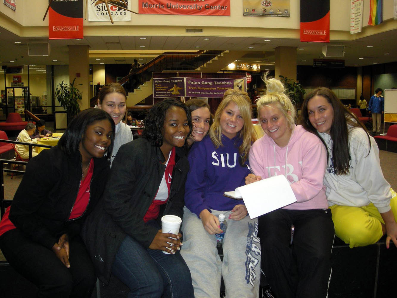法轮功学员经常来到这所学校,以“真善忍画展”和征签等方式,把法轮功的真相介绍给学生们。听闻真相的学生毕业了,又有新生入学,有缘人不断的有机会听到大法的福音。二零零九年四月十四日,学员们又来到这里,在学生中心再度挂起“法轮大法”横幅。摆在显著位置的展板和图片告诉人们,在中国无数信仰“真善忍”的法轮功学员被中共监禁、折磨,甚至被夺去了生命。