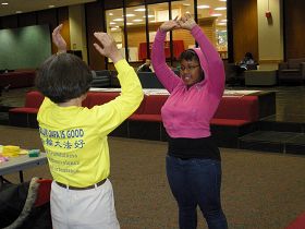许多美国人对中国修炼文化的了解,仅限于太极和气功这些词汇。法轮大法目前洪传到全世界八十多个国家和地区,没有年龄、种族以及宗教的限制,这使人们惊叹和好奇。有缘人希望有机会能学法轮功。在活动现场,学员们在悠扬的音乐中的集体炼功,吸引了过往学生的注意力。他们纷纷询问是否有炼功点可以学功,并留下自己的联络方式。有位学生当场向法轮功学员请教炼功动作,虽然只学了几个动作,她立刻就感到不可名状的美妙与神奇。