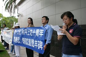 ![]() 休士顿法轮功学员中领馆前纪念“四·二五”十周年 |