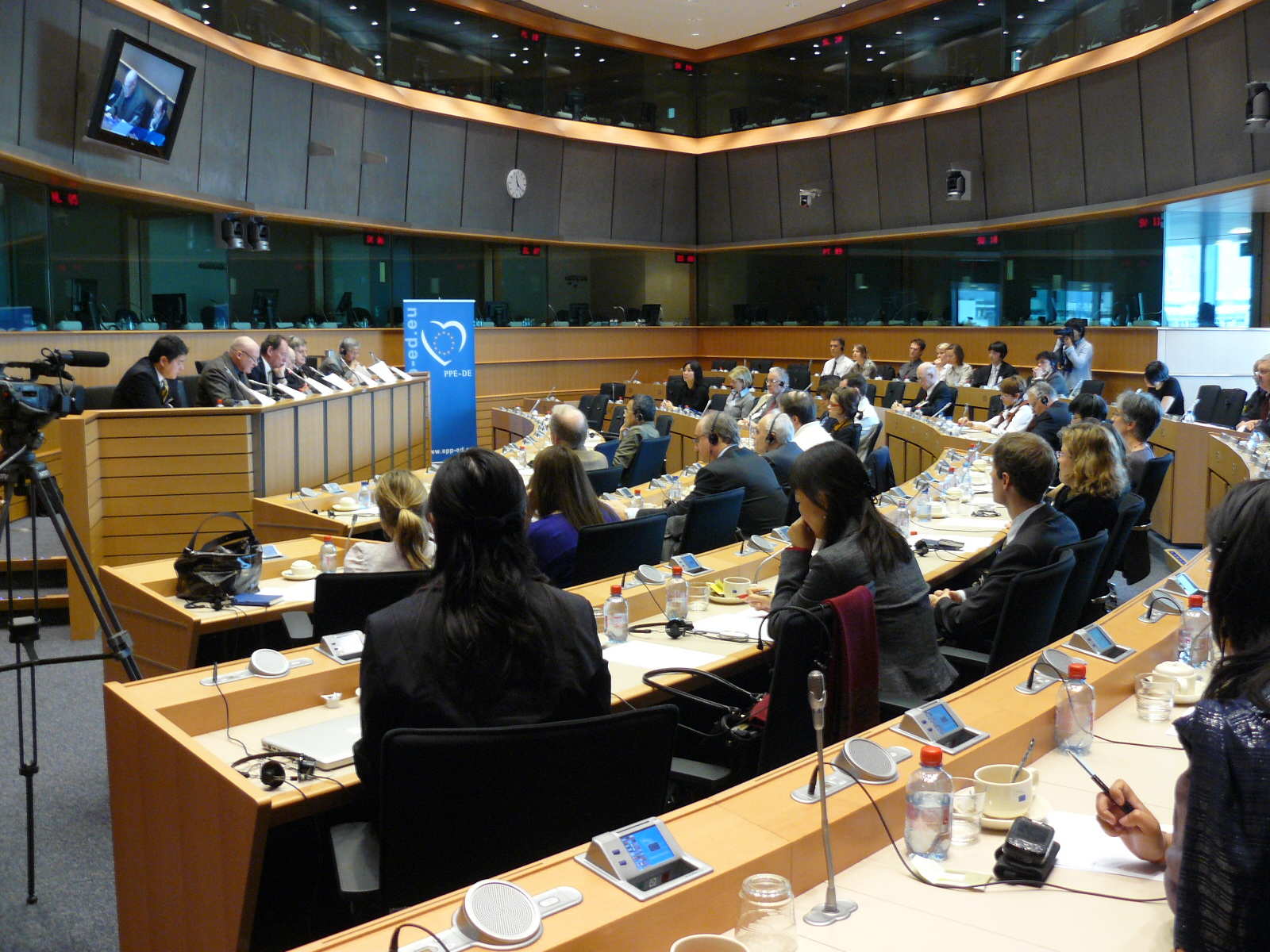 ![]() 欧洲议会关于中国宗教信仰自由及法轮功受迫害已历十年的听证会现场。 |