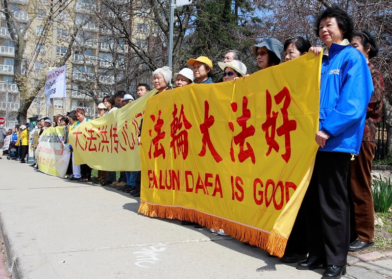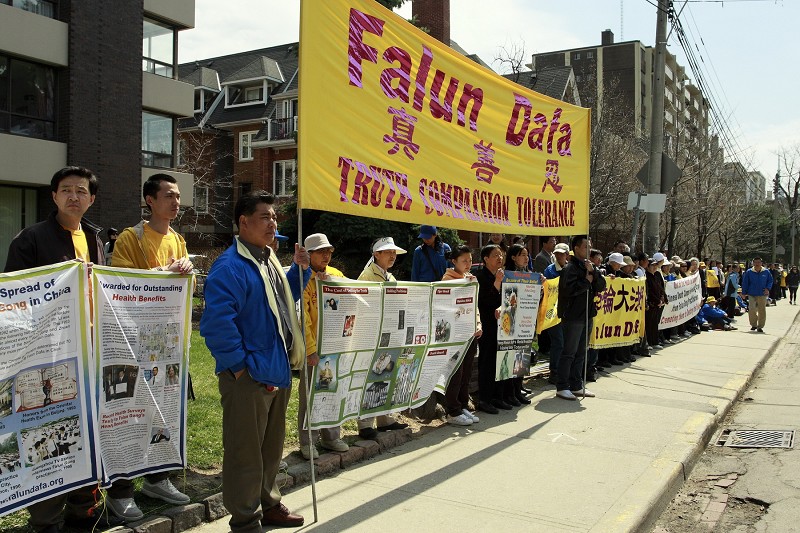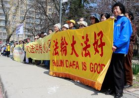 ![]() 2009年4月24日,数百名法轮功学员及支持者在多伦多中领事馆前集会,纪念“四·二五”十周年。 |