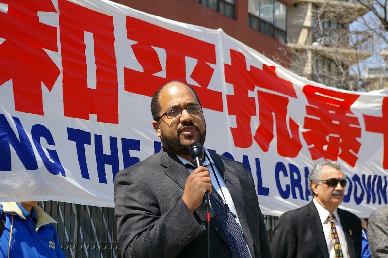 ![]() 多伦多律师Joel Etienne在纪念“四·二五”十周年集会发言。 |