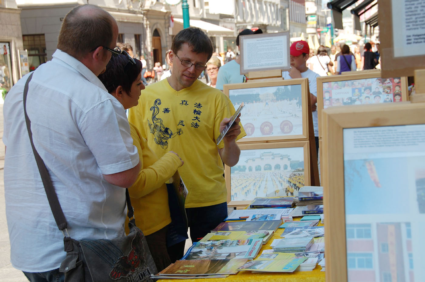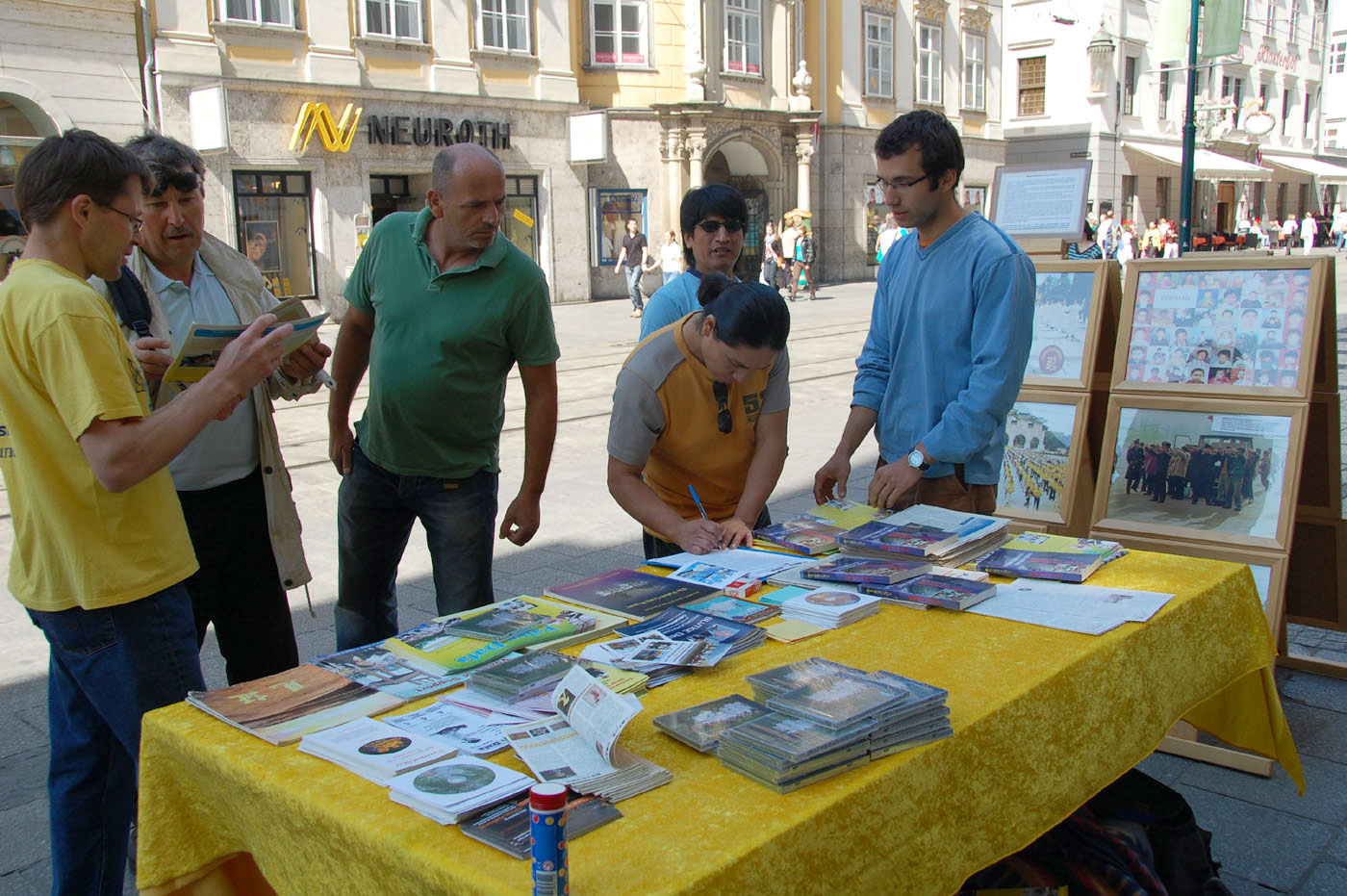【明慧网二零零九年四月二十六日】(明慧记者郑晴奥地利报导)二零零九年四月二十五日,奥地利法轮功学员分别在首都维也纳中国人的聚集地 Naschmarkt,和刚刚被选为本年度欧洲文化城首府、奥地利中部城市林茨(linz ),举行纪念“四·二五”活动。许多路过的民众驻足了解真相。在知道真相后,他们纷纷签名支持制止。短短几个小时,征签表格签满了一张,又一张 。