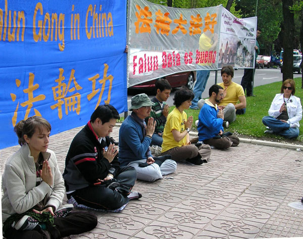 ![]() 西班牙部份学员在马德里中使馆前请愿,纪念“四·二五”,并要求停止迫害。 |