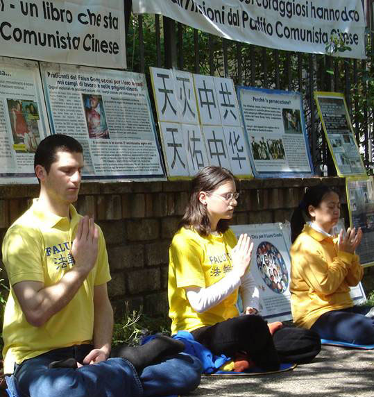 ![]() 罗马学员在中领馆前静坐,抗议中共迫害法轮功。 |
