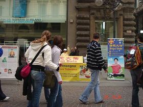 在米兰著名的旅游景点,以大诗人但丁的名字命名的步行街(Via Dante)上,成群结伴的游客在法轮功信息台前驻足,他们被优美舒展的法轮功炼功动作所吸引。当他们了解到中共对法轮功的惨绝人寰的迫害之后,更被法轮功学员在反迫害中表现的平和,坚韧和理性而感动。很多游客主动上前签字支持法轮功,谴责中共暴行。