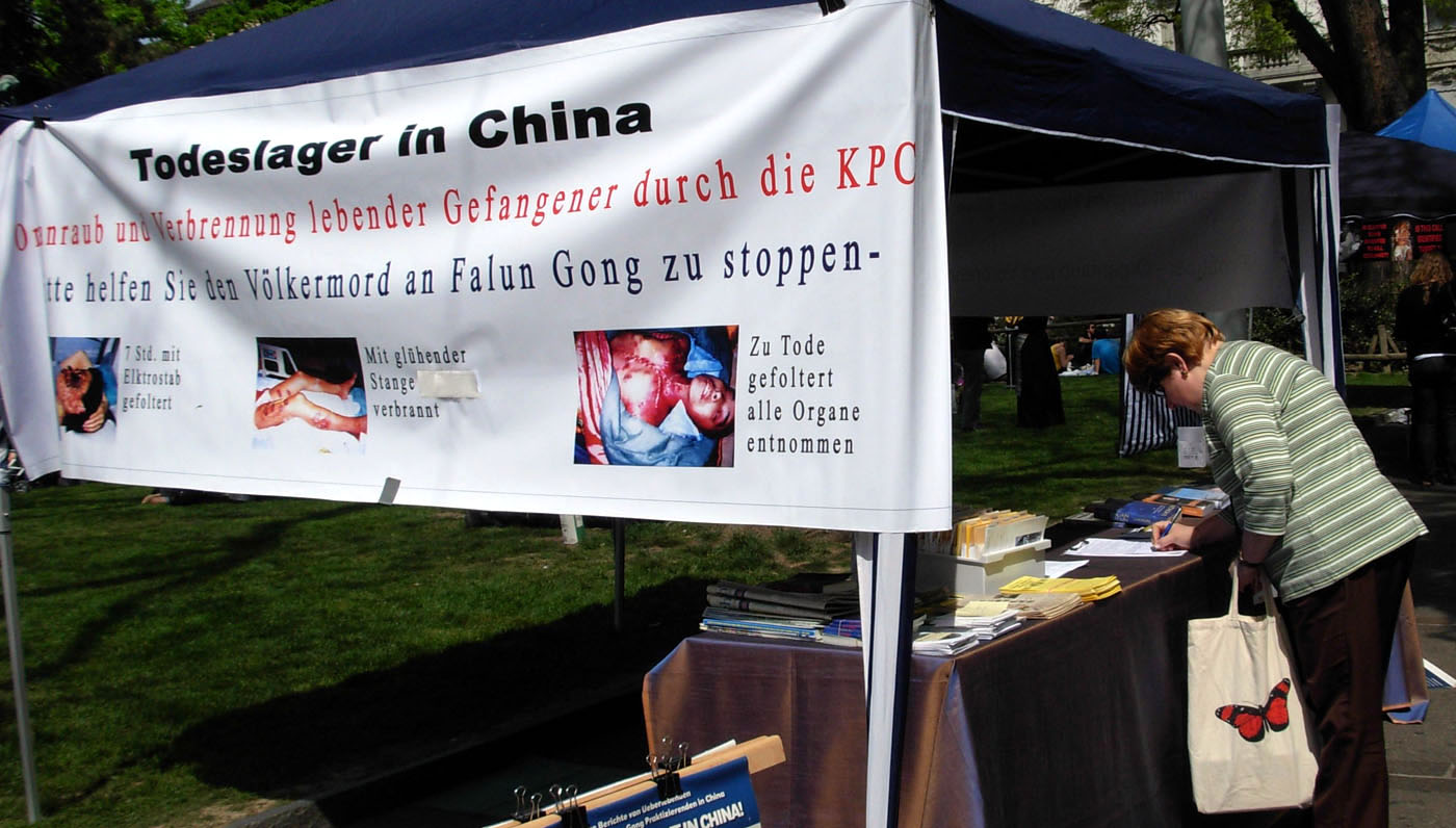 一对来自爱尔兰的夫妇在了解了法轮功学员受迫害的情况后,神色凝重,随即在征签表上签名,表示要制止中共活摘器官的罪行,并对法轮功学员说:做的好。